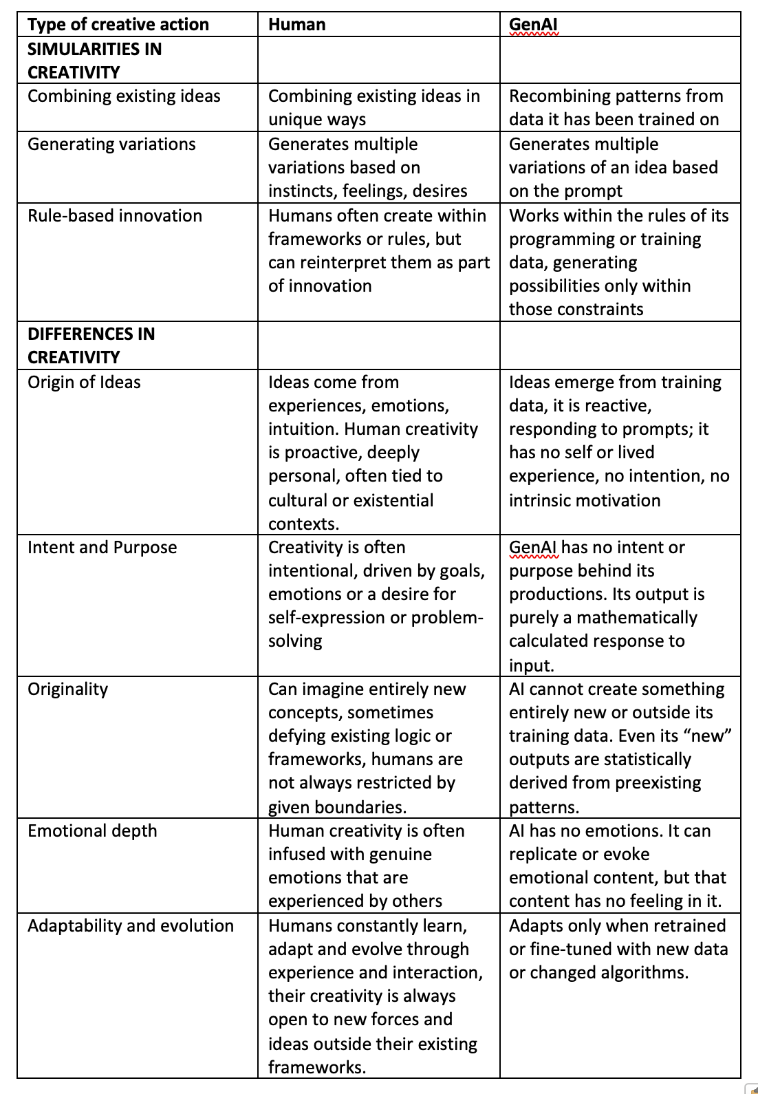 Here’s a comparison of GenAI and human creativity, mostly from a prompt to ChatGPT4o with a few edits from me. My prompt was “compare ways in which generative AI is creative to how human beings are creative, noting where they are similar and where they are different”. It gave a useful response.